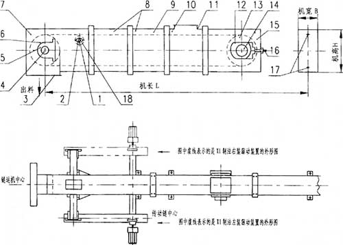 9、輸送鏈 10、中間節(非標) 11、進料口 12、尾軸承箱 13、尾輪 14、尾軸 15、尾部