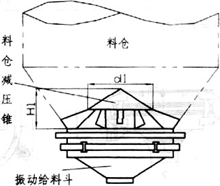 慣性振動給料斗在設計計算中已考慮了一定的倉壓,但建議在料倉內物料高度大于2m時,在料倉內安裝料倉減壓錐,以確保振動給料斗更穩定地工作,特別是確保其給料精度更趨準確。料倉減壓錐應焊接在料倉內,并保持平穩。料倉減壓錐安裝圖,安裝尺寸如下: