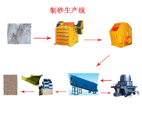 制砂生產線有振動給料機、顎式破碎機、制砂機、振動篩和膠帶傳輸機等設備組合而成。根據不同的工藝要求,各種型號的設備進行組合,滿足客戶的不同工藝要求。